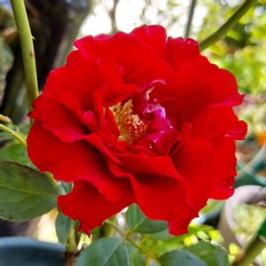 庭で鉢植えのバラ ヨハンシュトラウスが咲いています。雨が降り出す前に撮影。