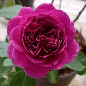 小雨の中 庭で鉢植えのバラ デュビレ デュ プリンス ドゥ モナコが咲いています。 400投稿目です。