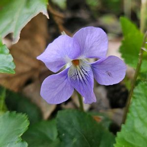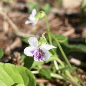 ニョイスミレ 別名: ツボスミレ スミレ科 花期: 4-6月 丈は5-25cmで茎を斜め横に伸ばします。葉は腎円形~心形で先が鈍く尖り、葉裏が赤味を帯びるものもあります。托葉は全縁。 花は1cmくらいで、側弁には毛が見られ、舌弁に多くの赤い筋が見られます。
