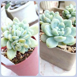 今日は昨夜からの雨🌂☔ どちらもロッティのタグ付きで買った多肉ちゃん。 全然違いますね〜😓 左側←外側の葉が長く密度高い 右側→葉が丸く平たい、隙間がある 日光浴させてるけどブルー寄り 右側奥↑、あまり写ってないけど丸い葉でプクプク密度高い どっちも可愛いからまあいっか😊 右側って天使の雫にも似てる様な?