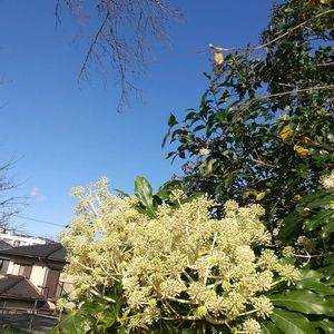 真っ青な冬の空とヤツデ。 コントラストがきれいに感じて撮ってみました。