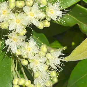 蕾がいっぱい付いていたレモンマートルの木、開花が始まり思いがけず可愛い花に驚いています😄