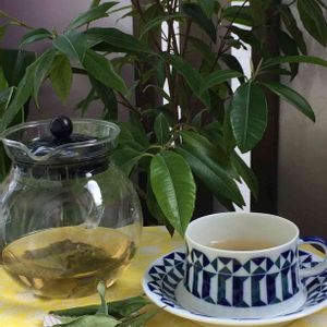 レモンマートル✨ ① 前に(10/27)レモンマートルをpicした時にお茶のpicのご提案をいただきました🍋ちょっと時間が経ってしまったけど picしてみました☺️ レモンマートルのハーブティー,本当に美味しい🍋酸っぱい感じではなく、アロマの香りのようなレモンの香りです✨ 奥の木は 育てているレモンマートル🌿 そして手前の小皿は、乾燥させてパリパリになった葉🍃それを透明のポットに細かくしてお湯を入れてレモンマートルのハーブティーを✨ カップに注ぐと さわやかな薄緑色に。ベランダにいい香りが広がります🍋 ホッと落ち着き癒されます☺️