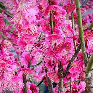 雨 模様 ⋆̩☂︎*̣̩ ꒰ 昨日のツボミ ꒱,’☂︎,' , 今日咲きました〜。 盆栽だった梅を地植えしたらたくさんの花が咲き実もなるようになりました。😆🫶 大きくしない様に選定は欠かせませんね。😄🙌