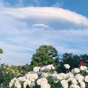 バラと不思議な雲😄 いい天気☀️ だけど、明日雨かなと思いながら見てた🤔 バラ満開🌹🌸🌹 キレイだなぁ〜❤️