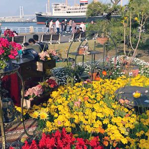 背景には船🚢 まさに横浜の花園🌸❤️ 魅せ方も勉強५✍ 苦手な分野💧 まずは寄せ植えを目指そう✨️