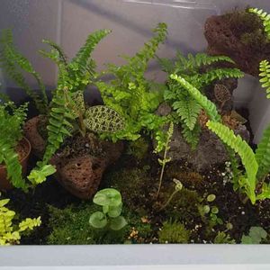 養生用に作ってみました♪ 蓋が閉まるので湿度管理しやすくてみんな元気です🤗 羊歯(4種かな?) ジュエルオーキッド トキワシノブ 苔 苔に関しては岡山で採取したものを含めおいおい投稿します♪