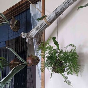 先程投稿した トキワシノブ の全体像です🪴 苔玉の吊り下げ仕立てで、 とっても爽やかな印象があります🎐 これからの季節シダ系の植物は 涼しげな雰囲気を与えてくれます😌🌿