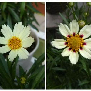 おはようございます😃 昨年の9月に 見切り品コーナーから連れて帰った コレオプシス スタークラスターです。 写真左 昨年の9月に撮影しました。 写真右 昨日の朝に撮影しました。 この品種は色が変わるのが特長で 夏は、写真左のように クリーム色の花が咲き 秋になって気温が下がると 写真右のように 紫色の模様が出てきますが・・・ 昨日の時点で模様が出てきました😅 昨日は真夏日に近い暑さだったのに 秋と勘違いしてるかもしれません💦 再び全国的に大雨になりそうです☔️ お気をつけ下さい‼️