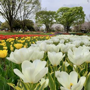 昭和記念公園② チューリップ畑がちょうど満開🤍 斑入りのチューリップは珍しい👀✨ダーウィスノーという品種らしい❄️ 3枚目のチューリップの川がお気に入り⭐️白いチューリップに混ざってところどころ色の違う花が咲いているのが印象的🤍💜🤍💛