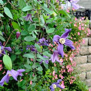 ミニバラ雅とクレマチス ローグチ 乱れ咲き 朝方まで、雨が 風が気持ち良い朝でした。 少しヒンヤリ。 北西角地で、 夏は西陽ガンガン 冬は北西の風がビューンビュン 条件の悪い場所で 毎年恒例 元気に咲いてます。💞💜💕💜❁