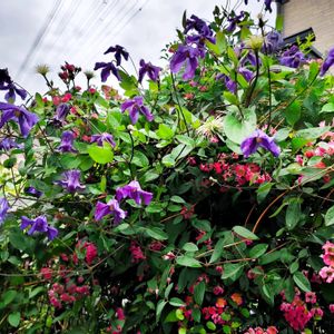 ❁💜クレマチス(ローグチ)と ❁💕ミニ薔薇(雅) 両方地植え 西側駐車場フェンス 今日の様子です。 🌿💞❁💜🌿💕💜🌿💙❁💜🌿💕❁💕🌿💜💙🌿❁💕💙💜💕