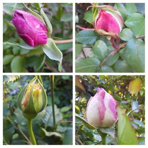 各花、第4コーナーを回り、ホームストレッチへ💨💨 ↖独産レイニーブルー。 花体が軽く大本命。 ↗独産アルブレヒトほにゃらら😅 ↙国産カンパネルラ。 ↘仏産ピエールドロンサール。花体重く苦戦😵 今年も蕾膨らみ開花レースが始まりました😊