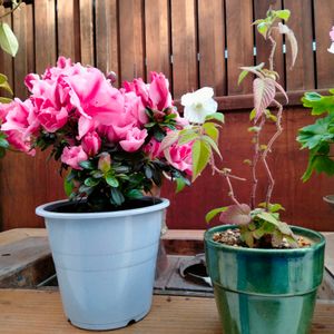 真弓(マユミ 左)と久留米躑躅(クルメツツジ) レジナ(右) レジナは剪定して、株分けして植え替えしました。 下側はマユミの花です(*^^*)