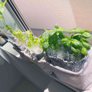 ヤシ繊維と水で育てている紫蘇とリサイクル根三つ葉がとっても元気 去年は外で育ててアザミウマにやられまくったので窓を開けて換気しながら室内で育てている このまま夏が終わるまで元気でいますように