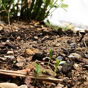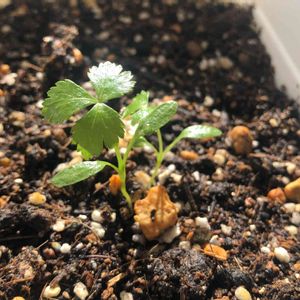 こぼれ種から発芽した三つ葉の芽。 親株から落ちまくり、発芽しまくりです。 庭の片隅が三つ葉畑と化しそうです。