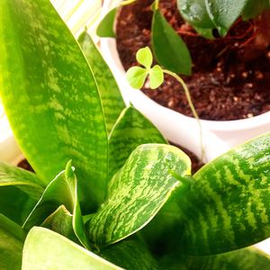 うちのサンスベリアの鉢から 突然生えてきた三つ葉☘️ ヒョロヒョロ伸びてきてかわいい♡ 何になるんだろ•*¨*•.¸¸♬