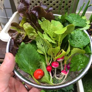 おはようございます☁️ 今朝は思ってたより明るくなくて、ちょっとガッカリ😌 今朝の収穫✨ まだ若い子ばかりで全体的に小さめ💦 ラデッシュ小さっ(笑)