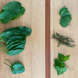 6/17 裏山にて。ちょこちょこっと採って来ました。ユキノシタ、クズ、オオバコ、コバギボウシ(半分)は天ぷらに。みつばは汁物。ギシギシ、コバギボウシ(残り半分)はお浸しに。