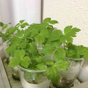 種まきから4週目のミツバです。ようやくミツバらしい葉が出てきました。水耕栽培でどこまで育つか楽しみです。