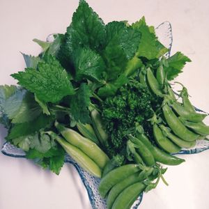 収穫 不断草、白、赤 ニンニクの芽 サニーレタス 三つ葉 グリーンピース お昼のお野菜たち、収穫です。