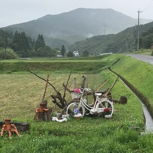 紫陽花と自転車と子供達と流木 そして 山と空がキャンパス❣️ 「Garden Decoration」やっておりまする