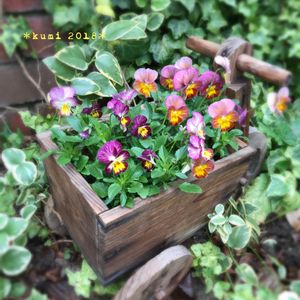 ビオラさんは元気です(*´∀`)♪ レンガを蔦っているアイビーが蝶🦋のよう!