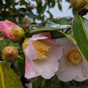 昨日は友達とランチに行って来ました🍽️ 雨の中☔山茶花でしょうか?葉の下で何やらひそひそ話をしてますよ(笑) 白にピンクがかわいい💞