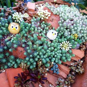 素焼きの鉢を割っちゃったので、この際 ブロークンポットガーデンに初挑戦。 だけど、欠片の固定が難しく安定しないので、焼かずに素焼きになる陶芸粘土で補強固定させたり、割れ目が鋭利でかなりキケンなので、そこも粘土で滑らかにさせたりして超苦戦!! 徒長して暴れん坊のジャイアントラビット親分の行き場に困ってたので、この際こちらへお引っ越ししてもらいました(笑) 他、ヒューミリス、ブルーエルフ、虹の玉(オーロラ?)とか・・いろいろ増えた子達を入れ込んで、仕上げに、陶芸粘土で作ったお家を建ててみた。 (秘密の屋根裏部屋付き (o≧▽≦)o) ハシゴは、庭木のいくりちゃん(スモモの木)の細枝を剪定した時に取っておいたものとワイヤーで。 ここに、ドワーフが住み着いてくれると嬉しいかな。 暖かくなったらお庭デビューしよう。。