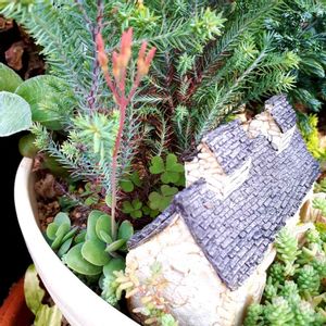 こんばんは🌙.*·̩͙.。★*゚ 今日はお昼にベランダでちまちまと 寄せ植えをしました😄❣️ この割れていた鉢🌱 お正月にばあちゃん🏠でもらって帰ってきたんです✌ 👩ばあちゃ~ん❗️この割れた鉢もらっていい~❔ 👵いいけど、そんな割れたやつどないするん❔ 👩多肉ちゃんに使うねんやん👍 👵はぁ~?( ・᷄ㅂ・᷅ )どないして多肉性に使うの。 と不思議そうに言われました。😅 裏庭に行くと綺麗に三分割になって放置されていたので こ、これはブロークンポット寄せ出来るんじゃないの😍 と思ってもらってきました(笑) 階段部分に使う為に少し自分で割って🔨 土を濡らしながら固めてのせ乗せ~ 木みたいな子はダイソーでGetした パンクチュラータさん🌳 チビセンペルちゃんとセダムさんたちで 寄せ植えしてどんぐりトトロを乗っけて完成🧚💕 うん❣️楽しかった😚👍💖 ばあちゃんにこうなってんで!って見せよっと😝