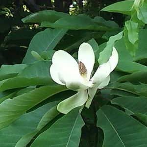 ホオの花…。 (朴の木) 10m程の木の枝に 20㎝位の大きな花が一輪 新緑の木々の中で 存在感を放っていました…