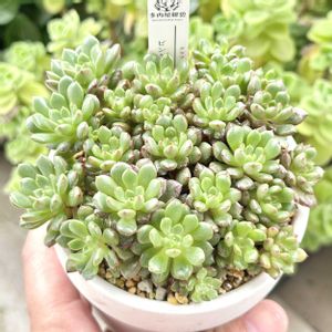 おはようございます🌞 今日の気温(7・21) 朝は寒過ぎ~:;((•﹏•๑)));: 寒がりさんなのでカイロ貼るだけは間に合わず着膨れる〜(*´艸`*) 先日寄せ植え用にピンクルちゃんポチッたら めっちゃ可愛い群生が届きました♥ 花束のようで✂︎出来ず結局 そのまま植えることに(*´ ˘ `*)ウフフ♡ 白雪ミセバヤをいくつか周りに挿し挿し🌱𓂃 𓈒𓏸 少し育った頃が見頃かなぁ💕