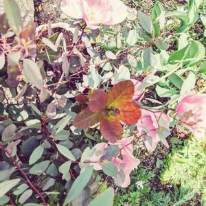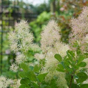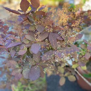 スモークツリー ’ヤングレディ’ 矮性で株を覆う程にスモークをつける。 みどりから淡いピンクに色が移り変わる。 はずなのに、昨年からいきなり淡いピンク。みどりの時が好きだったのに💦 下の方は花泥棒さんに✂️されて枝がありません。強剪定したら下から枝出てきますか。勇気なくて😓去年も出来なかった。ご存知の方お教えください🙏