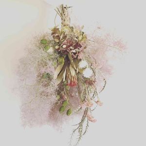 おはようございます🌞 ・ 先週、お客さまの自宅に出張でワークショップを開催しました💐 ・ スモークツリーを使った、初夏のスワッグを作りましたよ〜🌿 こちらは前日に私が作ったものです◎