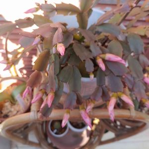 室内 鉢植えのデンマークカクタス エバ 😳ザンコクナ🎵 🎤 テンシノヨウニ🎵 シャコバサボテンとカニバサボテンの 交雑種らしく シャコバサボテンの形質が強い品種は 年内に開花することからクリスマスカクタス🎅とも 呼ばれるそうです😳 カクタスはサボテンの英語名とのことです😳