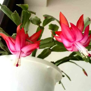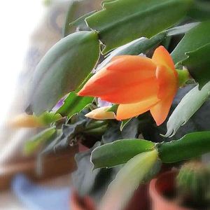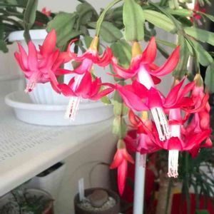 デンマークカクタス またの名をクリスマスカクタス またの名をシャコバサボテン❣️ 雪が降ると聞いてつい1週間前にやっと室内に取り込んだので、開花が始まりました。 やっぱり取り込むの遅っ! 外は極寒なのでいきなりリビングに置くと蕾がバラバラ落ちるだろうと予想して、東北の出窓に置いて徐々に慣らしています。 おかげでシケることなく次々と開花進行中。 こうして見ると本当にシャコみたいよね、花も葉っぱも😄 寒さで葉色が灰色っぽく退色していたのも少しずつ緑に戻って来ました。 満開になったらリビングか玄関に置こう💕 ただ今甥っ子の結婚式のために新幹線て新大阪へ移動中🚄💨 一泊だけど蘭たちの水加減が心配😝🌱
