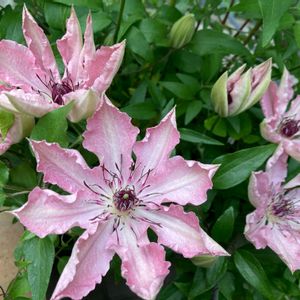 うちにあるクレマチスの中で 一番に咲き始めたサラ・エリザベス 𓂃 𓈒𓏸❀🌿 蕾がいっぱい まだ咲き始めたばかりで 開き切ってないけど… グレイッシュピンクというか シックなピンク色♡ 旦那さんSelect꙳✴︎ 昨日は一日中雨☔️でしたが 今日は少し青空が見えてきました ☁️⇨🌤 ひんやりした朝です ┼── Clematis 'Sarah Elizabeth'