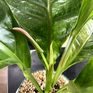 おはようございます🙋 ☁️で寒い😖 アンスリウムフーケリーさん🌱 新芽がまた伸びてきました😌