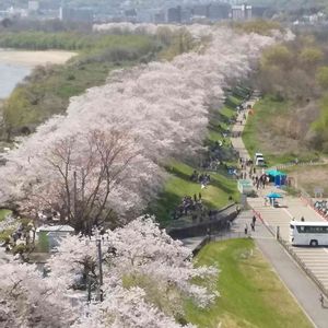 今日は良いお天気です。☀️🤗 京都府八幡市の淀川河川公園「背割堤さくらまつり」に来ました。🌸🌸👌 遠くに山崎サントリーウィスキー工場、左側に木津川、右側に宇治川(淀川の上流)が見えます。🥃🏞️😊😄🌞✌️