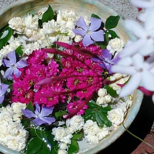 花友さんにすすめられ🌺花手水にチャレンジしてみました 昨日の☔雨で白モッコウバラが痛み 単独ライブは厳しいので〜 ツルニチニチソウと、紅色カランコエの友情出演となりました💓 アレレ〜、横から羽衣ジャスミンさん 飛び入り参加です!🎶