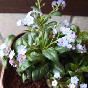 昨日、David Bowieの映画の紹介で投稿した忘れな草 『ミオソティス ミオマルク 』 私、忘れていない?と問いかけられ、今日はメインで投稿を😊 クローバーちゃん達と同じ日にお迎えしていたのに、忘れな草なだけに、すっかり投稿するのを忘れていました😅 自分の備忘録のためにも。 忘れな草 『ミオソティス ミオマルク 』 科名・属名: ムラサキ科ワスレナグサ属 宿根草(耐寒性多年草、または一・二年草) 学名:Myosotis hybrid 別名 : 勿忘草 わすれな草 ミオソチス 英名:forget-me-not(フォーゲットミーノット) ドイツ名:vergissmeinnicht(フェアギスマイン二ヒト) 花期 : 春 草丈 : 10~20cm前後 耐寒性 : 強い(環境差があるが-15℃~25℃ ) 耐暑性 : 強い ミオソティス ミオマルクは、ワスレナグサ(ミオソティス)の交雑種。 従来のワスレナグサに比べて花が大きいのが特徴。 咲き始めはピンクからラベンダー色に、そして最後には水色に花色が変化するのを楽しめる。 ピンクからのグラデーションが楽しめるのは3月の少しの季節だけとのことで、良い時期に撮影できました。 また、栄養系品種(挿し木等で増やした植物)なので葉や茎も強く、がっしりとした姿。 ドーム状にこんもりと咲き、姿もほとんど乱れない。 一般的なワスレナグサ(ミオソティス)は、夏の暑さに耐えられず一年草扱いになることが多いが、ミオソティス ミオマルクは暑さに強いので、上手く夏越ができれば翌春も花を楽しめる宿根草とのこと。 〜花言葉のエピソード〜 中世ドイツ。 若き騎士ルドルフと恋人のベルタがドナウ川のほとりを歩いていたところ、水際に咲く青い花を見つけた。 ルドルフはベルタのためにその花を摘もうとするが誤って川に落ちてしまう。 川に流されながらもルドルフは最後の力を振り絞って摘んだ花をベルタに投げ、「Vergiss-mein-nicht!(私を忘れないで)」と叫ぶと水の中に消えていった。 残されたベルタは、亡き恋人を思いながら、生涯この花を身につけ、やがてその花は「勿忘草」と呼ばれるようになったと言われる。 切ないお話がこの花の名前の由来となっています。 2023.3.17撮影
