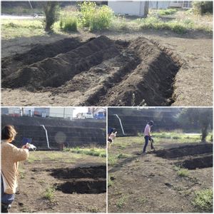 「休耕地の開拓隊」その③ 植木鉢で育てていたネモフィラ、ナデシコ等地植えにしました。こちらは数日後のpics.元気に育っているようです😉 左下pic.→お花の先生が、生徒さんたちと木のオブジェを作成。その周りにヒマワリの種蒔きをしました。これからが楽しみ✨😊です。