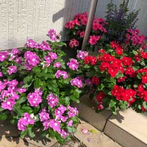 お手軽寄せ植えセット ビンカ(ニチニチソウ)、アンゲロニアの色違いコンボシリーズ かなり大きくなったので、玄関へ移動 大雨で、変な形(前に倒れてたり、真ん中パックリ)になってしまったけど、置き方を工夫したので、遠くから見たらわからない!
