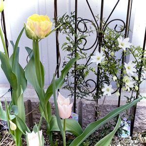 ジョーさんが咲いてきました♪ クレマチス✨カートマニージョーと チューリップ🌷あけぼの🌷楊貴妃の共演🎶 黄色いチューリップ(あけぼの)さんは きっと😆徒長したんだと思うけど… 花壇的にはちょうど良いバランスだわ🤣🤣💓