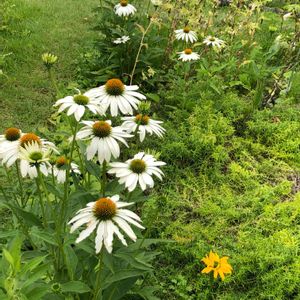 『エキナセア』白の右側に3株程ピンクのが有ったのに無くなりました😞 黄色もこれだけ⁉️ 毎年、種をこぼしてるのに、増えません❣️