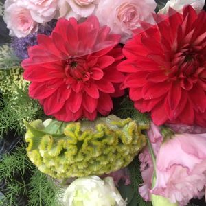 ケイトウ:グリーンサンゴ ダリア :レッドストーン バラ:ファンシーローラ トルコキキョウ:セレブプリンセス 夕霧草