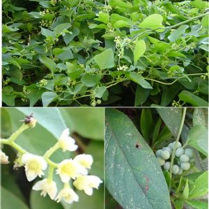 おはようございます アオツヅラフジ(青葛藤) ツヅラフジ科アオツヅラフジ属 落葉つる性木本 高いところで咲いていたので 特徴が良く撮れなかった 散歩道で 8月24日 メモ 北海道、関東地方以西〜沖縄の低地の草原や道端、林縁などに生える。枝は淡黄褐色の毛が生える。つるは右巻き。葉は互生。葉身は長さ3〜12cm、幅2〜10cmの広卵形〜卵心形。葉の形は変化が多く、ときに浅く3裂する。縁は全縁。両面とも淡黄褐色の毛がある。葉柄は長さ1〜3cm。雌雄別株。枝先と葉腋に小さな花序をだし、黄白色の花をつける。花弁と萼片は6個。雄花の雄しべは6個。雌花には雌しべ6個と仮雄しべが6個ある。花弁の先は2裂する。果実は核果。直径6〜7mmの球形で、10〜11月に粉白を帯びた黒色に熟す。核は直径約5mm。中心がへこんで、まるまった芋虫のような形をしている。外面には横方向に、やや細かいしわがある。別名カミエビ 花期は7〜8月 @松江の花図鑑より