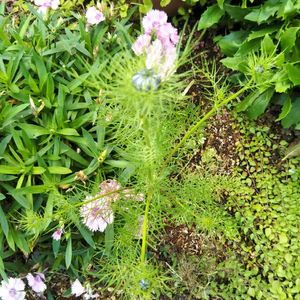 🎶ニゲラとアンジェラ♬ 午前中、急に雨が降ったりやんだり。 花壇の中のニゲラが倒れていたので、✂カットしました。アンジェラも花数は減りましたが、まだ、可愛く咲いています。 ニゲラですが、今年種から初めて育てました。今は緑ですがこのあとは、吊してドライにすればリースやスワッグに使えるのかな?