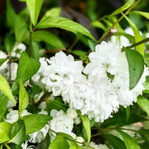 ヤエウツギ 別名:シロバナヤエウツギ アジサイ科 八重咲きの白い花です いつもの散歩道で咲いていました♬ 同じ八重咲きでも、花弁の外側が淡い桃紅色のサラサウツギというのもあるそうです