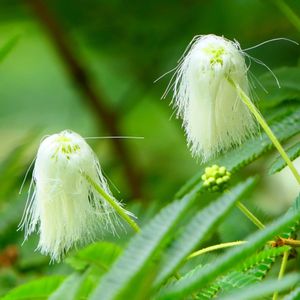 【白花合歓木】《マメ科》 花言葉 「歓喜」「夢想」「安らぎ」「創造力」 ネムノキの花は、 夜を待って丸い蕾(つぼみ)が 夕方からゆっくりて開いていく 白い絹糸のような 長く伸びた雄蕊 とても魅力的で神秘的